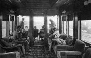 She went quickly to the writing desk at the end of the compartment, he with her, the eyes of the fat man and his wife following them like two pairs of searchlights swung by the same mechanism.